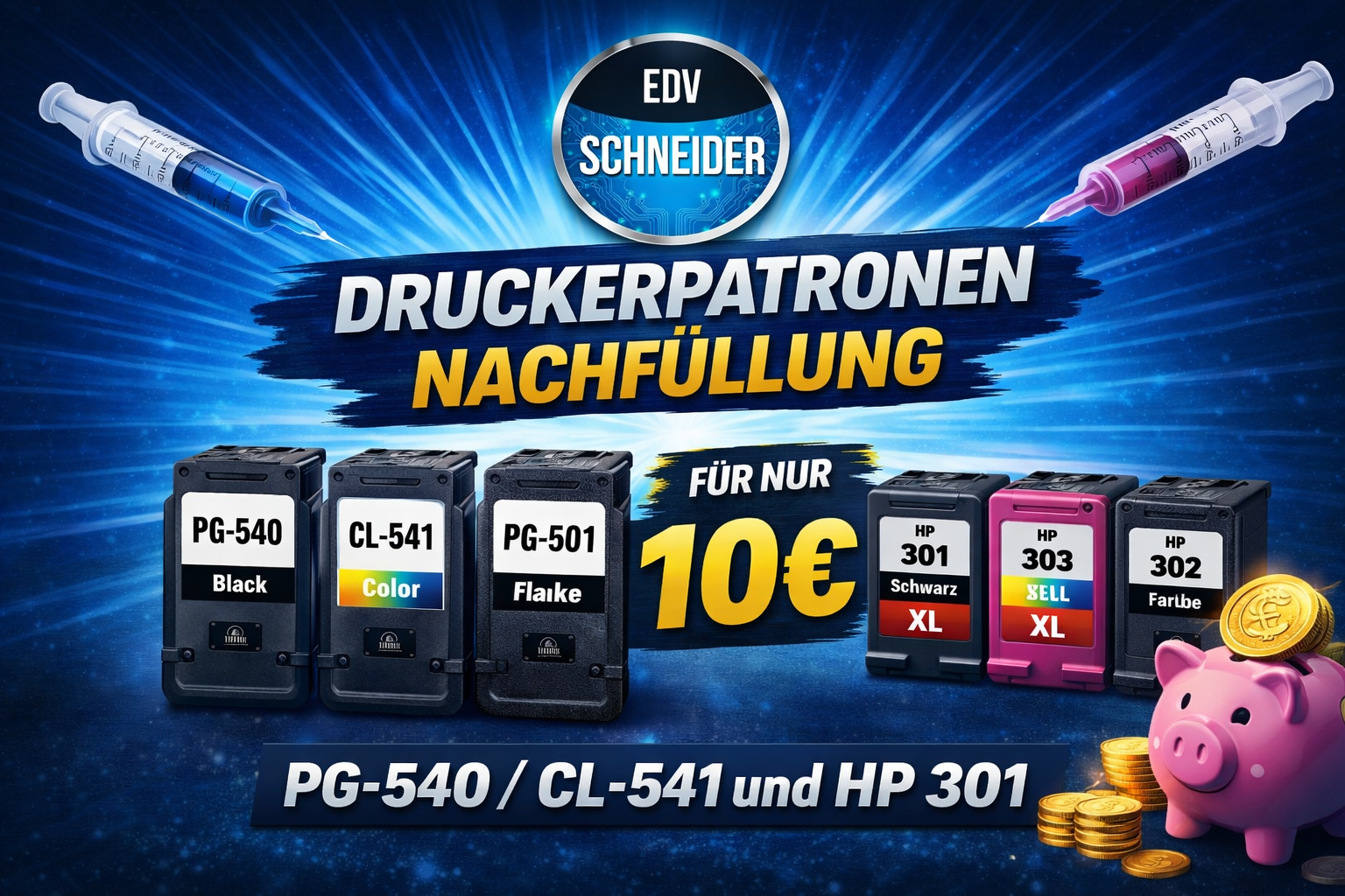 Wir befüllen Druckerpatronen wie Canon PG512/CL513 – PG540/CL541 – PG545/CL546 – PG560/CL561 … für 10€ pro Stk.